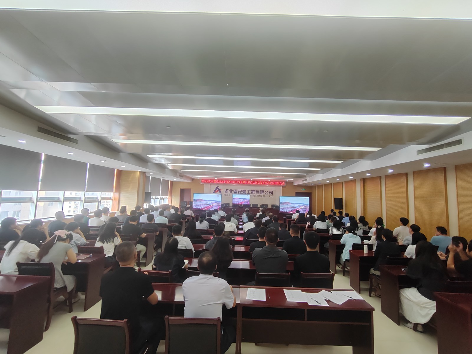 2025年9月3日,為紀(jì)念中國人民抗日戰(zhàn)爭(zhēng)暨世界反法西斯戰(zhàn)爭(zhēng)勝利80周年,河北省安裝工程有限公司積極組織職工集中觀看閱兵盛況直播。公司機(jī)關(guān)及各分公司、項(xiàng)目部共計(jì)2000余人通過多種方式同步參與,共同回顧歷史、緬懷先烈、展望未來。上午9時(shí),習(xí)近平總書記發(fā)表重要講話,9時(shí)19分大閱兵正式開始,公司機(jī)關(guān)及各分公司、項(xiàng)目部會(huì)議室座無虛席,職工們們整齊地坐在屏幕前,神情莊重地注視著電視畫面。在閱兵式過程中,